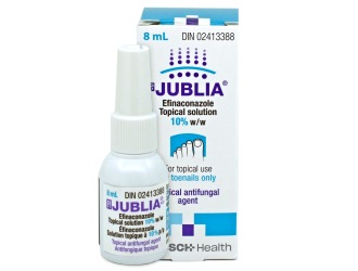 Jublia (Efinaconazole) is a topical antifungal solution used to treat a fungal infection of the toenails called onychomycosis. Efinaconazole is a new triazole antifungal that acts as a 14a-demethylase inhibitor for the tropical treatment of onychomycosis.The main active ingredient of Jublia is efinaconazole. Each mL of clear solution contains 100 mg of efinaconazole. Nonmedicinal ingredients: alcohol, butylated hydroxytoluene, C12-15 alkyl lactate, citric acid, cyclomethicone, diisopropyl adipate, disodium edetate, and purified water.